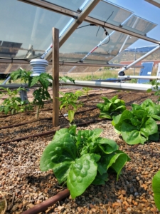 Above: Lettuce, tomatoes, and peppers grow under a semitransparent solar panel array in a green roof system. This is known as rooftop agrivoltaics. Photo by Thomas Hickey.